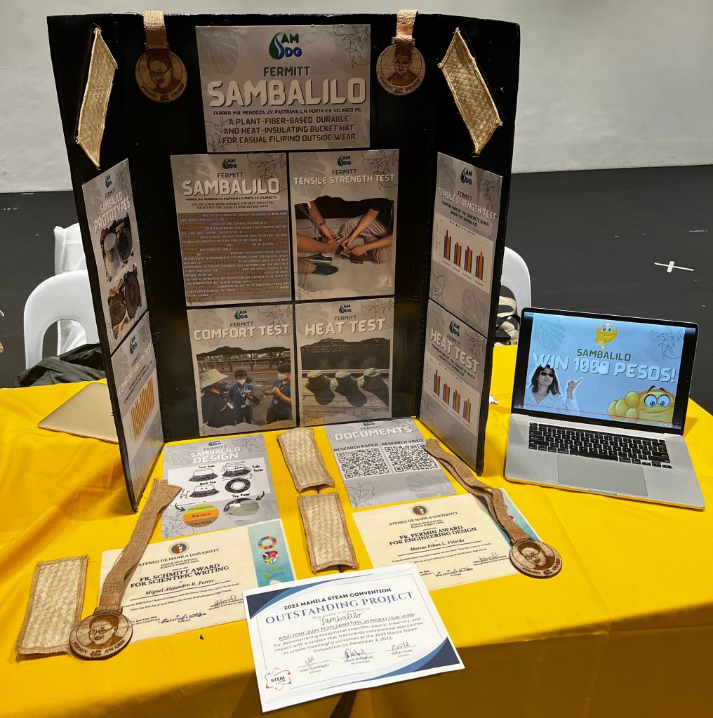 Each school year, students in the Ateneo Junior High School are tasked with creating a research invention that tackles a local problem using the different SDGs. Inspired by the roofing used in local Bahay Kubos, we invented a multi-layered sustainable fabric with various applications. In creating a bucket hat with the Sambalilo fabric, Filipino farmers were given a voice.